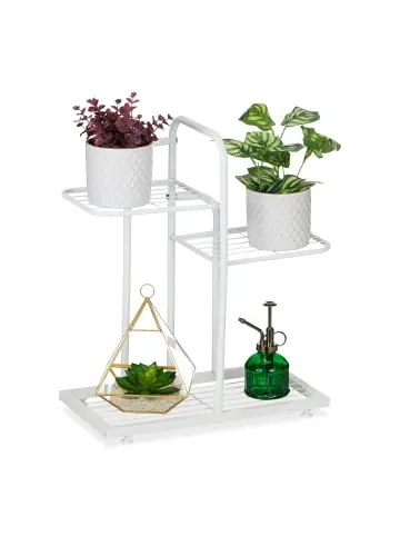 Das Pflanzenregal schafft endlich den nötigen Platz, um Deine geliebten Blumen dekorativ zu präsentieren. Bunte Blüten, Kräuter, Blumentöpfe, Deko und Vasen lassen sich auf den 3 Stufen optisch schön anrichten. Gestalte Deine persönliche kleine Pflanzenecke im Wohnzimmer oder Wintergarten oder stelle das Blumengestell geschützt im Garten, auf dem Balkon und der Terrasse auf. Die vielseitig einsetzbare Pflanzentreppe ist zudem vollständig aus robustem, pulverbeschichtetem Stahl gefertigt.Pflanzenständer im Detail – Größe H x B x T: ca. 50,5 x 44 x 22 cm – Untere Ablage B x T: ca. 41 x 22 cm – 2 Ebenen B x T: ca. 22 x 19 cm – Traglast je Ebene: ca. 3 kg – Gewicht: ca. 0,8 kg – Material: Stahl (pulverbeschichtet) – Farbe: WeißBlumenständer für Deine grünen Schätze – Im Wohn- und Schlafzimmer, Wintergarten etc. platzieren – Geschützt auch auf Balkon, Terrasse, im Garten aufstellen – Blumentöpfe, Pflanzen, Vasen, Kräuter uvm. in Szene setzen – Robustes und stabiles Stahlgestell mit Pulverbeschichtung – Modernes Design in Weiß mit 3 praktischen Gitterablagen – Justierbare Füße für stabilen Stand bei BodenunebeneheitenLieferumfang – 1x Blumentreppe in Einzelteilen – Mit Anleitung – Mit Montagematerial – Dekoartikel sind nicht im Lieferumfang enthalten
