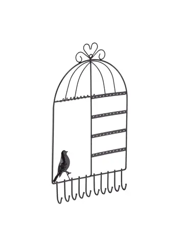 Mit diesem Schmuckhalter bewahren Sie Ihren Schmuck übersichtlich und geordnet auf. Der Schmuckorganizer bietet Platz für Ohrringe und -stecker, Armbänder, Uhren und Halsketten. Da die Schmuckleiste an die Wand montiert wird, lassen sich auch lange Halsketten problemlos aufhängen und sind vor Verheddern geschützt. Dank des romantischen Vogelkäfig-Designs ist der Ohrringhalter zudem ein echter Hingucker und eine stylische Präsentationsmöglichkeit für Ihren Lieblingsschmuck.Schmuckhalter Wand im Detail – Maße H x B x T: ca. 44,5 x 25,5 x 4,5 cm – Max. Traglast: ca. 3 kg – Gewicht: ca. 330 g – Material: Pulverbeschichtetes Eisen – In verschiedenen FarbenSchmuckaufhänger für Accessoires – 4 Leisten für Ohrringe und -stecker – Für 20 Paar – 10 Haken für kurze Halsketten – 10 Haken für lange Halsketten Wandschmuckhalter aus Metall – Zur übersichtlichen Schmuckaufbewahrung – Zum Aufhängen von Ketten, Ohrringen uvm. – Schützt Halsketten vor lästigem Verheddern – Montage an der Wand oder im Kleiderschrank – Gestaltet als Vogelkäfig im Vintage-DesignLieferumfang – 1x Schmuckhaken in Farbe nach Wahl – Dekoartikel und Wandmontagematerial sind nicht im Lieferumfang enthalten