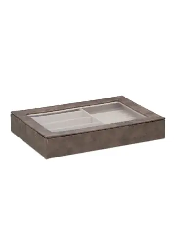 Mit diesem Schmuck-Organizer bewahrst Du Deine liebsten Schmuckstücke geordnet und übersichtlich auf. Die Ringlade bietet viel Stauraum für Ringe oder auch Manschettenknöpfe, in den schrägen Fächern werden Ohrringe, Halsketten und Armbänder ordentlich verstaut. Der weiche Samtbezug der Schmuckbox bietet dabei Schutz vor Kratzern. Das elegante Design in Lederoptik macht den Schmuckbehälter zu einem tollen Hingucker auf dem Schmink- und Frisiertisch.Schmuckkästchen im Detail – Maße H x B x T: ca. 5 x 30 x 21 cm – Ringhalter mit 12 Rollen B: ca. 11,5 cm – 4 Fächer H x B: ca. 4 x 16 cm – Gewicht: ca. 0,6 kg – Material: Polyester, Samt, MDF, Pappe – In verschiedenen FarbenEdler Schmuckkasten in Lederoptik – Zur ordentlichen und übersichtlichen Schmuckaufbewahrung – Mit Ringhalter und schrägen Fächern für Ohrringe – Modernes Design in Lederoptik und cremefarbenem Innenleben – Weicher Samtbezug schützt Schmuckstücke vor Kratzern – Staubgeschützte Aufbewahrung dank abnehmbarem Deckel – Mit Sichtfenster zur stilvollen Präsentation Deiner LieblingsteileLieferumfang – 1x Schmuckkiste in Farbe nach Wahl – Dekoartikel sind nicht im Lieferumfang enthalten