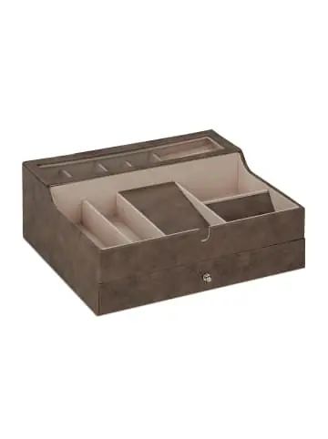 Mit diesem Schmuck-Organizer bewahrst Du Deine liebsten Schmuckstücke geordnet und übersichtlich auf. Die Schublade und die verschiedenen Fächer bieten Stauraum für Halsketten, Armbänder, Ohrringe und Brillen, Ringe werden ordentlich in der Schmuckbox verstaut. Der weiche Samtbezug der Ringlade bietet dabei Schutz vor Kratzern. Das elegante Design in Lederoptik macht den Schmuckbehälter zu einem tollen Hingucker auf dem Schmink- und Frisiertisch.Schmuckkästchen im Detail – Maße H x B x T: ca. 13 x 34 x 31 cm – Gewicht: ca. 1,7 kg – Material: Polyester, Samt, MDF, Pappe – In verschiedenen FarbenSchmuckkiste mit vielen Fächern – 2 Fächer links obere Etage H x B x T: ca. 5,5 x 5,5 x 9 cm – 4 Fächer mittig obere Etage H x B x T: ca. 5 x 4,5 x 4,5 cm – Ringhalter mit 6 Rollen B: ca. 11 cm – 2 Fächer links untere Etage H x B x T: ca. 4 x 5 x 18,5 cm – Fach mittig untere Etage H x B x T: ca. 3,5 x 9,5 x 18,5 cm – 2 Fächer rechts untere Etage H x B x T: ca. 4 x 11,5 x 9 cm- Großes Fach in Schublade H x B x T: ca. 4 x 31,5 x 14 cm – 3 kleine Fächer in Schublade H x B x T: ca. 4 x 10,5 x 13,5 cmEdler Schmuckkasten in Lederoptik – Verschiedene Fächer zur übersichtlichen Schmuckaufbewahrung – Für Ohrringe, Halsketten, Ringe, Armbänder und Uhren – Modernes Design in Lederoptik und cremefarbenem Innenleben – Weicher Samtbezug schützt Schmuckstücke vor Kratzern – Schublade und Fächer mit Deckel für staubgeschützte AufbewahrungLieferumfang – 1x Schmuckkoffer in Farbe nach Wahl – Dekoartikel sind nicht im Lieferumfang enthalten