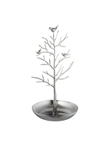 Der Schmuckbaumständer in verspielter Optik lässt Frauen- und Mädchenherzen höher schlagen. An den zahlreichen Verästelungen finden Deine Lieblingsschmuckstücke wie Ketten und Ohrringe ausreichend Platz. Uhren, Broschen oder Anhänger können auf dem praktischen Schmuckteller abgelegt werden. Das edle Baum-Design macht den Kettenhalter auch ohne viel Schmuck zum dekorativen Accessoire im Bad oder Schlafzimmer. Nie wieder suchen: Mit dem Schmuckständer hast Du Deine Kostbarkeiten stets im Blick.Schmuckständer im Detail – Maße H x B x T: ca. 30 x 16 x 15 cm – Ast Länge: ca. 1 bis 4 cm – Schmuckablage H x D: ca. 2,5 x 15 cm – Gewicht: ca. 340 g – Material: Zink – In verschiedenen FarbenSchmuckhalter mit Ablage – Ketten, Ohrringe, Armbänder und Ringe übersichtlich aufhängen – Elegantes Design in Form eines Baumes mit kleinen Vögeln – Viel Platz für all Deine Lieblingsstücke dank der vielen Verästelungen – Mit praktischem Schmuckteller zum Ablegen von Uhren und mehr – Baum und Schale sind schnell zusammengeschraubtLieferumfang – 1x Schmuckbaum in Farbe nach Wahl – Dekoartikel sind nicht im Lieferumfang enthalten