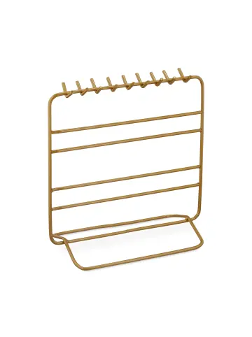 Im Bad liegt alles voller Schmuck, die Ketten sind verheddert und Sie können Ihre Lieblingsohrringe nicht finden? Dieser Schmuckständer ist die Lösung! Auf 18 Haken ist Platz für Ihre Ketten, Ringe und Armbänder und die 4 Querstangen sind ideal für die Aufbewahrung von Ohrhängern und Armbändern mit Verschluss. Doch auch Uhren oder Sonnenbrillen sind gut auf dem Schmuckhalter aufbewahrt. Durch das schlichte Design steht Ihr Schmuck im Mittelpunkt und der Kettenständer passt in jede Einrichtung. Schmuckständer im Detail – Maße Gesamt H x B x T: ca. 21 x 20 x 10 cm – 18 Kettenhaken Länge: je ca. 1,5 cm – 4 Querstangen Abstand: ca. 2 cm und 4,5 cm – Gewicht: ca. 220 g – Material: Eisen – FarbauswahlKettenhalter Schmuck für Bad und Schlafzimmer – 18 kleine Haken für Ketten, Armbänder und Ringe – 4 breite Stangen für Ohrhänger, Uhren und Brillen – Schlichtes Design für funktionale Nutzung- Perfekte Ergänzung für das Schminktisch Zubehör – In schicken Farben für Ihre individuelle EinrichtungLieferumfang – 1x Schmuckständer – Dekoartikel sind nicht im Lieferumfang enthalten