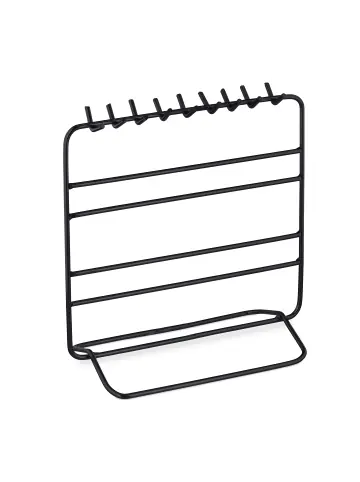 Im Bad liegt alles voller Schmuck, die Ketten sind verheddert und Sie können Ihre Lieblingsohrringe nicht finden? Dieser Schmuckständer ist die Lösung! Auf 18 Haken ist Platz für Ihre Ketten, Ringe und Armbänder und die 4 Querstangen sind ideal für die Aufbewahrung von Ohrhängern und Armbändern mit Verschluss. Doch auch Uhren oder Sonnenbrillen sind gut auf dem Schmuckhalter aufbewahrt. Durch das schlichte Design steht Ihr Schmuck im Mittelpunkt und der Kettenständer passt in jede Einrichtung. Schmuckständer im Detail – Maße Gesamt H x B x T: ca. 21 x 20 x 10 cm – 18 Kettenhaken Länge: je ca. 1,5 cm – 4 Querstangen Abstand: ca. 2 cm und 4,5 cm – Gewicht: ca. 220 g – Material: Eisen – FarbauswahlKettenhalter Schmuck für Bad und Schlafzimmer – 18 kleine Haken für Ketten, Armbänder und Ringe – 4 breite Stangen für Ohrhänger, Uhren und Brillen – Schlichtes Design für funktionale Nutzung- Perfekte Ergänzung für das Schminktisch Zubehör – In schicken Farben für Ihre individuelle EinrichtungLieferumfang – 1x Schmuckständer – Dekoartikel sind nicht im Lieferumfang enthalten