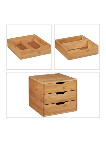 Die Büro-Aufbewahrungsbox aus Bambus bietet nützlichen Stauraum, um Schreibutensilien und Briefe zu ordnen. Mit der offenen Ablagefläche oben und den 3 Schubladen sind Sie bestens ausgerüstet, um die Ordnung auf Ihrem Schreibtisch zu bewahren und fokussiert zu arbeiten. Nicht nur als Büroablage sondern auch im Jugendzimmer für Schularbeiten kann die Schubladenbox ein nützliches Tool sein, um Stifte, Büroklammern, Klebezettel und andere Utensilien zu verstauen.Schreibtisch Organizer im Detail – Größe H x B x T: ca. 26 x 30 x 31 cm – Fächer in oberer Schublade H x B x T: ca. 5 x 13 x 28,5 cm – Gewicht: ca. 5 kg – Material: Bambus – Farbe: NaturFlexible Fächer in unterer/mittlerer Schublade – Fächer H x B: ca. 7 x 26 cm – Tiefen bei Trennwand vorne: ca. 9 und 19 cm – Tiefen bei Trennwand hinten: ca. 16,5 und 11 cm – Schubladen ohne Trennwand H x B x T: ca. 7 x 26 x 28,5 cmPlatzsparende Schreibtischablage – Organizer mit 3 Schubladen für Büro-Utensilien – Stifte, Büroklammern, Klebeband und mehr verstauen – 2 Schubladen mit flexibel einsetzbarer Trennwand – Briefe, Dokumente oder Stifte darin ablegen – Freundliche und warme Naturfarbe aus Bambus – Für Arbeitszimmer, Jugendzimmer und BüroLieferumfang – 1x Schreibtischorganisator – Dekoartikel sind nicht im Lieferumfang enthalten