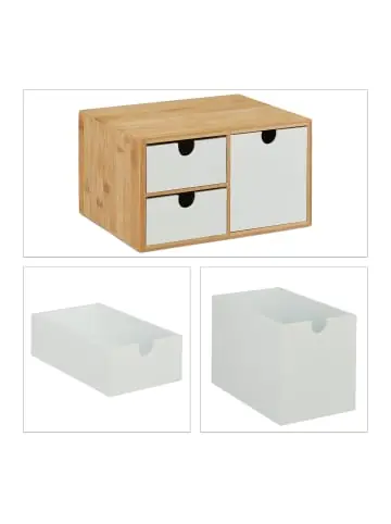 Mit diesem Schubladenelement aus Bambus und MDF schaffst Du im Nu Ordnung in Deinen 4 Wänden. Mit 3 Schubladen in 2 Größen bietet die Ordnungsbox viel Platz für Kleinteile aller Art. Für Bürozubehör auf dem Schreibtisch ist der Schubladenkasten ebenso geeignet, wie für Make-Up-Utensilien auf dem Schminktisch, Tee und Kaffeekapseln in der Küche oder Bastelzubehör im Atelier. Das moderne, natürliche Design des Schreibtisch Organizers passt garantiert in jeden Raum.Schubladenbox im Detail- Maße H x B x T: ca. 14,5 x 25 x 20 cm- Innenmaße kleine Schubladen H x B x T: ca. 4,5 x 10 x 18 cm – Innenmaße große Schublade H x B x T: ca. 11,5 x 10 x 18 cm – Gewicht: ca. 1,8 kg – Material: Bambus, MDF – Farbe: Weiß, NaturMini Kommode mit Schubladen- Als Organizer für Büro, Arbeits- oder Kinderzimmer – Ordnungssystem für Zettel, Büromaterialien oder Bastelzeug – Auch für Make Up, Nähzeug, Schmuck, Nägel, Schrauben uvm. – Natürliche Bambus passt in Küche und Bad, auf Schreibtisch etc. – Mit 3 leicht ausziehbaren Schubladen aus MDF Lieferumfang – 1x Schreibtischorganisator – Dekorationsartikel sind im Lieferumfang nicht enthalten
