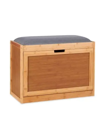 Dank der großen Sitztruhe wird das Ausziehen der Schuhe noch leichter. Setze Dich auf die gepolsterte Sitzfläche in schicker Leinenoptik und schlüpfe bequem aus Deinen Schuhen. Diese kannst Du im Anschluss im Schuhkipper verstauen. Die Schuhkommode hat 2 verstellbare Fächer, so dass auch etwas höhere Schuhe Platz finden. Insgesamt kannst Du in der Flurbank 6 Paar unterbringen. Dank der Fertigung aus Bambus ist die Schuhbank sehr robust und wird zum Highlight im Eingangsbereich Deiner Wohnung.Schuhbank im Detail – Gesamtmaße H x B x T: ca. 49 x 63 x 29,5 cm – Sitzhöhe: ca. 45 cm – Maße Schuhablage B x T: ca. 57,5 x 31 cm – Höhe der Fächer verstellbar: 10,5 / 11 cm und 12 / 9,5 cm – Gewicht: ca. 7,5 kg – Traglast: ca. 80 kg – Material: Bambus, Polyester, Schaumstoff – Farbe: Natur, GrauSchuhtruhe aus Bambus mit grauer Sitzfläche – Materialmix aus Bambus mit grauem Stoff in Leinenoptik – Griffmulde für einfaches Öffnen des Schuhkippers – Ausreichend Platz für bis zu 6 Paar Schuhe – Verstellbares Brett für unterschiedliche Höhe der Ablagen – Sorgt für Ordnung im Eingangsbereich – Moderner Schuhschrank für Flur und Diele – Bequeme Sitzfläche für erschöpfte BeineLieferumfang – 1x Schuhsitzbank in Einzelteilen – Mit Anleitung und Montagematerial – Dekoartikel sind im Lieferumfang nicht enthalten