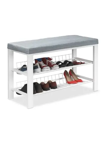 Ob in der Diele, im Wohn- oder Schlafzimmer: Die Schuhbank fügt sich in jede Räumlichkeit dezent ein. Die Sitzpolsterung mit Stoffbezug ist nicht nur dekorativ, sondern überzeugt auch mit Sitzkomfort – zusammen mit dem Metallgestell entsteht ein moderner Materialmix. So kannst Du bequem sitzen, während Du Dir die Schuhe an- oder ausziehst. Auf den 2 Ebenen der Schuhablage finden 6 bis 8 Paar Schuhe übersichtlich. Platz, wodurch Chaos im Flur verhindert wird.Schuhbank mit Polster im Detail – Maße gesamt H x B x T: ca. 50,5 x 82 x 33 cm – Fläche je Ablage B x T: ca. 73 x 25,5 cm – Traglast: max. 300 kg – Gewicht: ca. 7,5 kg – Material: Eisen, MDF, Polyester – In verschiedenen FarbenSchuhregal zum Sitzen – Schuhaufbewahrung im Flur, Wohn- oder Schlafzimmer – Auf 2 Ablagen bis zu 8 Paar Schuhe griffbereit verstauen – Stabiles Metallgestell sorgt für sicheren Stand – Dank bequemem Polster auch zum Sitzen geeignet – Füße mit Bodenschonern verhindert KratzerLieferumfang – 1x Schuhbank in Einzelteilen – Mit Montagematerial und Anleitung – Dekoartikel sind im Lieferumfang nicht enthalten