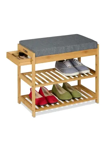 Diese Schuhbank fügt sich wunderbar in Diele, Wohn- oder Schlafzimmer ein. So kannst Du bequem sitzen, während Du Dir die Schuhe an- oder ausziehst. Die graue Sitzpolsterung mit Leinenbezug ist nicht nur dekorativ, sondern überzeugt auch mit Sitzkomfort – zusammen mit dem Bambusgestell entsteht ein moderner Materialmix. Auf den 2 Ebenen der Schuhablage finden 4 bis 6 Paar Schuhe übersichtlich Platz. Die Schublade bietet zusätzlichen Stauraum für allerlei Kleinigkeiten.Schuhbank im Detail – Maße gesamt H x B x T: ca. 49 x 55 x 30 cm – Fläche je Ablage B x T: ca. 52 x 30 cm – Schublade innen H x B x T: ca. 3,5 x 22 x 21,5 cm – Traglast: max. 120 kg – Gewicht: ca. 3,8 kg – Material: Bambus, Leinen, MDF, Schaumstoff – Farbe: Natur, GrauSchuhregal zum Sitzen – Schuhaufbewahrung im Flur, Wohn- oder Schlafzimmer – Auf 2 Ablagen bis zu 6 Paar Schuhe griffbereit verstauen – Stabiles Gestell aus Bambus und Kissen mit Leinenüberzug – Dank bequemem Polster Schuhe im Sitzen anziehen – Kleine Schublade für zusätzlichen StauraumLieferumfang – 1x Schuhbank in Einzelteilen – Mit Montagematerial und Anleitung – Dekoartikel sind nicht im Lieferumfang enthalten