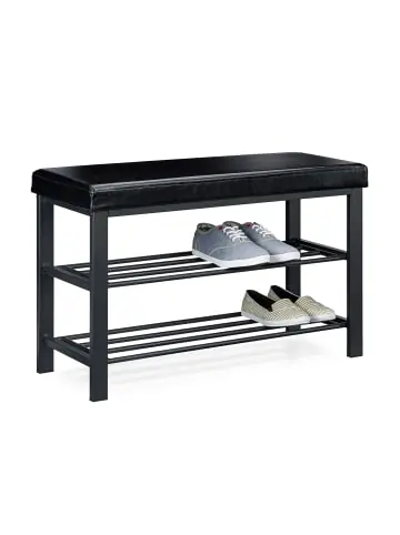 Diese praktisch schlichte Schuhbank in Weiß, Schwarz oder Braun wird Ihren Flur aufräumen. Auf den zwei Ablageflächen aus Metall haben Sie Platz für mindestens 12 Schuhe. Damit schaffen Sie genug Stauraum für den nächsten Besuch.Die multifunktionale Sitzbank kann ebenso als Sitzgelegenheit genutzt werden. Die weiche Polsterung aus Kunstleder sorgt für ein angenehmes Sitzgefühl und mehrere Personen finden auf der Bank Platz. Mit der beigelegten Anleitung ist ein einfacher Aufbau garantiert. Details der Schuhbank mit Polsterung• Abmaß H x B x T: ca. 49 x 81 x 31 cm • Gewicht ca. 7,2 kg • Material Polsterung: Kunstleder • Material Gestell: Rostfreies Metall (pulverbeschichtet) • 19 cm Abstand zwischen den 2 AblagenSchuhbank mit Polsterung aus Kunstleder• In 3 verschiedenen Farben erhältlich: Schwarz, Weiß und Braun • Insgesamt bis zu 8 Paar Schuhe auf den zwei Ablagen unterbringen • Belastbarkeit Sitzfläche: bis 100 kg • Einfach Montage• Vielseitig einsetzbarLieferumfang • 2 Seitenteile• 2 Ablagen• Schrauben• Aufbauanleitung • Dekorationsartikel sind im Lieferumfang nicht enthalten