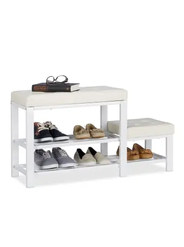Sich im Flur auf die Schnelle die Schuhe an- oder auszuziehen, wird dank der vielseitigen Schuhbank zum reinsten Vergnügen. Anstatt sich im Stehen zu quälen, nehmen Sie einfach auf der bequemen und optisch raffinierten Sitzpolsterung Platz. Der Kinderhocker bietet auch Ihrem kleinen Liebling erstklassigen Sitzkomfort. Ein Schuhregal mit 2 Etagen für Ihre Straßen- oder Hausschuhe ist in die Sitzbank bereits integriert, sodass Sie keinen zusätzlichen Schuhschrank im Flur, Schlaf- oder Wohnzimmer benötigen. Die Metallbeine münden in Schoner aus Kunststoff, sodass sich die Flurbank nicht in Form unschöner Kratzer im Untergrund verewigt.Schuhbank mit Hocker im Detail – Maße gesamt H x B x T: ca. 50 x 90,5 x 30,5 cm – Maße Hocker H x B x T: ca. 28,5 x 30,5 x 30,5 cm – Fläche je Ablage B x T: ca. 52 x 24,5 cm – Material: Kunstleder, pulverbeschichtetes Metall, MDF – Gewicht: ca. 8,6 kgSchuhregal zum Sitzen – Schuhaufbewahrung im Flur oder Schlafzimmer – Angenehme Optik für jede Einrichtung – 2 Ebenen für Ihre Schuhe – Gemütliche Sitzpolsterungen – Sitzbank für Kinder und ErwachseneLieferumfang – 1 x Schuhbank in Einzelteilen – Mit Montagematerial – Mit Anleitung – Dekoartikel sind im Lieferumfang nicht enthalten