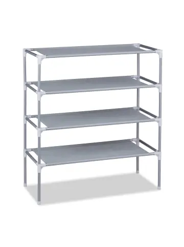 Diese Schuhablage bietet idealen Stauraum für den Flur oder das Treppenhaus. Auf den 4 breiten Ablagen aus Vlies können insgesamt – je nach Größe – bis zu 12 Paar Schuhe abgestellt werden. Die Böden passen zusammen mit der minimalistischen Schönheit des Regals in jede Einrichtung. Der Aufbau geht durch das simple Stecksystem leicht von der Hand. Diese Konstruktion kann beliebig erweitert werden. Bauen Sie 2 Regale übereinander oder lassen Sie Ablagen weg bis Sie Ihre persönliche Wunschhöhe haben.Schuhregal Stoff im Detail – Maße gesamt H x B x T: ca. 68 x 62 x 28 cm – Maße je Ebene B x T: ca. 52 x 25 cm – Abstand zwischen Ablagen: ca. 15 cm – Bodenfreiheit: ca. 17,5 cm – Traglast pro Ebene: ca. 3 kg – Gewicht: ca. 900 g – Material: Eisen, Vliesstoff, Kunststoff – In verschiedenen Farben erhältlichErweiterbare Schuhablage – Tiefe für Damenschuhe bis Größe 41 geeignet- Sandaletten, Sneakers und Ballerinas verstauen – Auf 4 Etagen Platz für bis zu 12 Paar Schuhe – Bei Kinderschuhen mehr – Schlicht, praktisch und einfach montiert ohne Werkzeug – Sehr leicht und beweglich – Somit auch ideal für Camping – Höhe kann beliebig erweitert werdenLieferumfang – 1x Schuhregal in Einzelteilen – Mit Aufbauanleitung und Montagematerial – Dekoartikel sind nicht im Lieferumfang enthalten