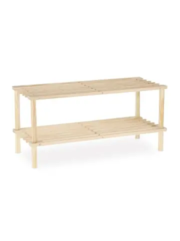 Mit diesem Schuhständer setzen Sie stilvoll Akzente im Treppenhaus oder im Eingangsbereich Ihrer Wohnung. Das Schuhregal besteht aus Kiefernholz und besticht mit seiner natürlichen Optik. Dank seiner platzsparenden Form kann das Schuhgestell auch in schmalen Treppenhäusern und engen Fluren platziert werden. Insgesamt bietet das praktische Holzschuhregal auf 2 Ebenen Stauraum für bis zu 4 Paar Schuhe.Schuhregal im Detail – Maße H x B x T: ca. 29,5 x 63 x 26 cm – Ablage oben B x T: 63 x 26 cm – Ablage unten B x T: 57 x 26 cm – Abstand zwischen den Ablagen: ca. 17,5 cm – Traglast: ca. 10 kg – Gewicht: ca. 1,1 kg – Material: Kiefernholz – Farbe: NaturSchuhgestell mit 2 Ebenen – Bietet auf 2 Etagen Platz für bis zu 4 Paar Schuhe – Platzsparende und schmale Form – Geeignet für Flure und Treppenhäuser – Dank offener Gestaltung Schuhe stets griffbereit – Natürliche Holzoptik ist ein BlickfangLieferumfang – 1x Schuhablage in Einzelteilen – Montagematerial und bebilderte Anleitung – Dekoartikel sind nicht im Lieferumfang enthalten