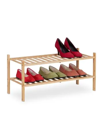Mit diesem platzsparenden Schuhregal gehören herumliegende Schuhe der Vergangenheit an. Durch ihre kompakte Größe findet die Schuhablage überall einen Platz, egal ob in einem kleinen Flur, einer Ecke im Schlafzimmer oder unter der Treppe. Auf den 2 Ebenen aus robusten Bambusstäben können bis zu 6 Paar Schuhe verstaut werden. Das naturbelassene Gestell ist stapelbar und sorgt nicht nur für ein optisches Highlight, sondern auch für eine hohe Stabilität.Schuhregal im Detail – Maße H x B x T: ca. 32 x 68,5 x 28 cm – Maße je Ablagefläche B x T: ca. 65,5 x 28 cm- Abstand zwischen Ablagen: ca. 15 cm – Traglast: ca. 10 kg – Gewicht: ca. 1,4 kg – Material: Bambus – Farbe: NaturPraktisches Schuhgestell mit 2 Ebenen – Zur geordneten Aufbewahrung von bis zu 6 Paar Schuhen – Platzsparende Schuhablage für Flur und kleine Räume – Offenes Schuhgestell sorgt für schnellen Zugriff auf Schuhe – Dekoratives, naturbelassenes Design zum Stapeln geeignet- Schnelle Montage der stabilen Schuhablage aus BambusLieferumfang – 1x Schuhregal in Einzelteilen – Mit Anleitung und Montagematerial – Dekoartikel sind nicht im Lieferumfang enthalten