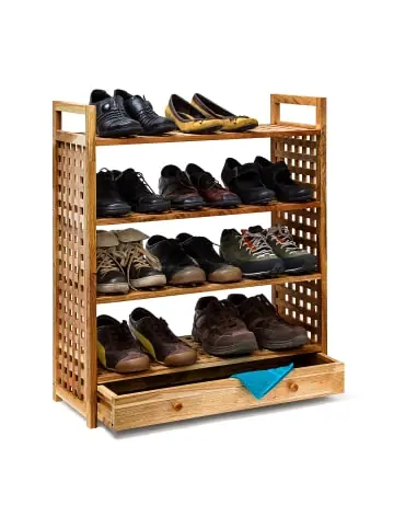 Mit diesem Holz Regal können Sie Ihre Schuhe ordentlich und übersichtlich lagern. Die 4 Ablagen bieten jeweils Platz für ungefähr 3 Paar Schuhe. Auf dem obersten Boden können Sie zudem größeres Schuhwerk wie Stiefel oder Winterschuhe abstellen.Praktisch ist die ausziehbare Schublade unter der ersten Ablage: Dort können Sie kleinere Sachen wie Schuhcreme, Schnürsenkel oder Einlegesohlen verstauen. Mit dem hellen Walnussholz sorgt der Schuhständer für ein freundliches, rustikales Flair in Ihrem Heim.Details des Schuhregals aus Walnuss mit Schublade • Größe H x B x T: ca. 81 x 70 x 27 cm • Wiegt ca. 8,3 Kg • Material: helles Walnussholz, geölt • 4 Ablagen, deren oberstes ein Stiefelfach ist • Mit Schubfach zum AusziehenSchöne Schuhablage im Landhaus Stil • Natürlicher, heller Holz Look für Ihre Einrichtung • Schafft Stauraum in Flur, Diele, Korridor und Treppenhaus • Schönes Gittermuster auf Böden und Seitenteilen • Verstauen Sie Politur, Schnürsenkel, Tücher uvm. im Schubfach • Praktische Tragegriffe ermöglichen ein bequemes TragenLieferumfang • 2x Seitenteile • 4x Ablagen • Schubfach in Einzelteilen • Schrauben und Sechskant • Dekorationsartikel sind im Lieferumfang nicht enthalten