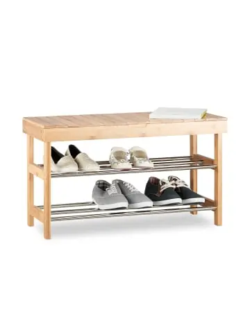 Das Schuhregal mit Sitzfläche setzt natürliche Akzente in der Garderobe. Der helle, freundliche Holzton der Schuhbank fügt sich in jede Einrichtung. Der platzsparende Alltagshelfer für den Flur bietet neben zwei Ablagen auch eine aufklappbare Sitzfläche mit Stauraum. Auf der Schuhablage sind Hausschuhe für Sie und Ihre Gäste gut aufgehoben. In dem Staufach bringen Sie Schuhputzzeug und vieles mehr unter. Die breite Sitzbank mit praktischem Stauraum ist eine sinnvolle und stilsichere Ergänzung im Eingangsbereich.Mit der Garderobenbank aus Bambus holen Sie sich natürliches Design in Ihr Heim.Schuhregal mit Sitzfläche im Detail • Maße H x B x T: ca. 43 x 74 x 30 cm • Traglast: ca. 100 kg • Gewicht: ca. 5 kg • Material: Bambus, MetallSchuhschrank mit Sitz und Stauraum • Schuhablage für 6 Paar Schuhe • Ablagen Höhe: ca. 13 cm und 15 cm • Staufach H x B x T: ca. 4 x 67 x 27 cm • Sitzfläche B x T: ca. 74 x 30 cmPraktische Flurbank • Schickes Schuhregal mit breitem Sitz • Sitzbank für zwei Personen • 2 Ablagen für Damen- und Herrenschuhe • Belastbare Bank ohne LehneLieferumfang • 1x Schuhregal mit Sitzfläche in Einzelteilen • Inkl. Montagematerial • Dekoartikel sind nicht im Lieferumfang enthalten