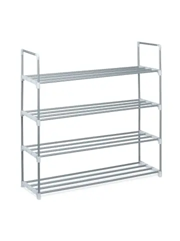 Die silberne Schuhablage bietet idealen Stauraum für den Flur oder das Treppenhaus. Dabei finden bis zu 4 Paar Schuhe je Ebene Platz. Somit hast Du Dein liebstes Schuhwerk passend zum Outfit oder Wetter jederzeit griffbereit. Das stabile Metallgestell der Schuhaufbewahrung sorgt dabei für die notwendige Stabilität. Da der Aufbau des Schuhregal Stecksystems einfach und schnell von der Hand geht, ist der Schuhständer ebenso ideal beim Camping. Wähle die Anzahl der Etagen je nach Bedarf aus.Schuhregal im Detail – Gesamtmaße 2 Ebenen H x B x T: ca. 45 x 90 x 31 cm, ca. 0,8 kg – Gesamtmaße 3 Ebenen H x B x T: ca. 70 x 90 x 31 cm, ca. 1,2 kg – Gesamtmaße 4 Ebenen H x B x T: ca. 93 x 90 x 31 cm, ca. 1,7 kg – Gesamtmaße 5 Ebenen H x B x T: ca. 114,5 x 90 x 31 cm, ca. 2,1 kg – Gesamtmaße 7 Ebenen H x B x T: ca. 160,5 x 90 x 31 cm, ca. 3 kg – Material: Stahl, Kunststoff – Farbe: Silber, WeißSchuhaufbewahrung zum Stecken – Maße je Ebene B x T: ca. 86,5 x 26,5 cm – Abstand zwischen Ablagen: ca. 22 cm – Traglast je Ablage: ca. 7 kg – Bodenfreiheit: ca. 2,5 cmStabiler Schuhständer aus Metall – Ordentliche und übersichtliche Aufbewahrung Ihrer Schuhe – Je Ebene finden bis zu 4 Ihrer liebsten Schuhpaare Platz – Schlichtes Design in Silber ist vielseitig kombinierbar – Stabiles Stecksystem ist im Handumdrehen aufgebaut – Flexible Schuhablage für Flur, Treppenhaus oder CampingLieferumfang – 1x Schuhregal Stecksystem in Größe nach Wahl – Mit Anleitung und Montagematerial – Dekoartikel sind nicht im Lieferumfang enthalten