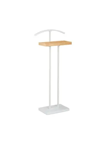 Sie sind auf der Suche nach einer eleganten Weise, Ihre Kleidung faltenfrei aufzubewahren? Dann ist der Damendiener die richtige Entscheidung. Er verfügt über einen Kleiderbügel auf der Sie Jacken, Jacketts, Hemden oder Ähnliches aufhängen können. Auf der kleineren Stange, die in der Ablage aus hellem Holz integriert ist, legen Sie Hosen oder Röcke ab. Zudem können Sie auf der schmalen Ablage Manschettenknöpfe, Ketten, Uhren und vieles mehr verstauen.Platzieren Sie den weißen Kleiderständer in Schlaf- oder Ankleidezimmer und sorgen Sie damit für Ordnung.Stummer Diener im Detail – Maße H x B x T: ca. 102 x 46 x 24 cm – Gewicht: ca. 3,8 kg – Material: MDF, Metall, Holz – Farbe: WeißStiller Butler mit Ablage – Traglast: max. ca. 3 kg – Ablagefläche B x T: ca. 36 x 7,5 cm – Hosenstange H x B: ca. 88 x 36 cm – Kleiderbügel H x B: ca. 102 x 46 cmDressboy für knitterfreie Garderobe – Ausgestattet mit Kleiderbügel u. Hosenstange – Mit praktische Ablage für Kleinteile, wie Uhr – Elegantes und modernes Design in Weiß – Sicherer Stand dank Gewicht – Freistehend – Ideal für Bad, Schlaf- u. AnkleidezimmerLieferumfang – 1x Stummer Diener in Einzelteilen – Mit Anleitung und Montagematerial – Dekoartikel sind nicht enthalten