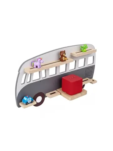 Das praktische Tonies-Regal bietet Platz für bis zu 25 Toniesfiguren, die dank der Magnetstreifen sicher an Ort und Stelle bleiben. Das Kinderregal verfügt zudem über eine Aussparung für die Toniebox und die Ladestation, sodass das ganze Tonies-Sortiment übersichtlich an einem Ort verstaut ist. Das kindgerechte Design in Busform lädt Kinder dazu ein, die Hörfiguren selbstständig in das Tonieregal einzuräumen und sich ihre Lieblingsgeschichten auszuwählen.Toniebox Regal im Detail – Maße H x B x T: ca. 32 x 62 x 13 cm – Gewicht: ca. 1 kg – Material: MDF, Kiefernholz – Verschiedene Farben erhältlichToniefigurenregal in Busform – Zur Aufbewahrung von bis zu 25 Toniesfiguren – Magnetstreifen für sicheren Halt der Figuren – Mit Aussparung für Toniebox und Ladestation – Kindgerechtes Design in dekorativer Busform – Zur platzsparenden Befestigung an der Wand – Inklusive Material zur einfachen WandmontageLieferumfang – 1x Kinderzimmerregal in Einzelteilen – Mit Montagematerial – Dekoartikel sind nicht im Lieferumfang enthalten