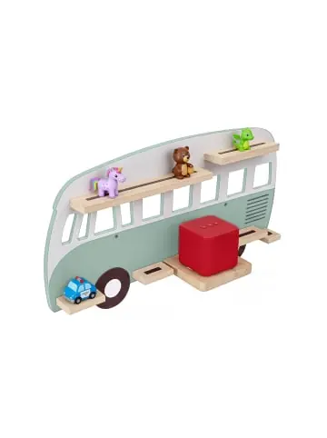 Das praktische Tonies-Regal bietet Platz für bis zu 25 Toniesfiguren, die dank der Magnetstreifen sicher an Ort und Stelle bleiben. Das Kinderregal verfügt zudem über eine Aussparung für die Toniebox und die Ladestation, sodass das ganze Tonies-Sortiment übersichtlich an einem Ort verstaut ist. Das kindgerechte Design in Busform lädt Kinder dazu ein, die Hörfiguren selbstständig in das Tonieregal einzuräumen und sich ihre Lieblingsgeschichten auszuwählen.Toniebox Regal im Detail – Maße H x B x T: ca. 32 x 62 x 13 cm – Gewicht: ca. 1 kg – Material: MDF, Kiefernholz – Verschiedene Farben erhältlichToniefigurenregal in Busform – Zur Aufbewahrung von bis zu 25 Toniesfiguren – Magnetstreifen für sicheren Halt der Figuren – Mit Aussparung für Toniebox und Ladestation – Kindgerechtes Design in dekorativer Busform – Zur platzsparenden Befestigung an der Wand – Inklusive Material zur einfachen WandmontageLieferumfang – 1x Kinderzimmerregal in Einzelteilen – Mit Montagematerial – Dekoartikel sind nicht im Lieferumfang enthalten