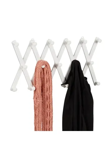 Ein aufgeräumter Eingangsbereich vermittelt sofort einen guten ersten Eindruck. Mit dieser Wandgarderobe sorgst Du für Ordnung und Übersichtlichkeit. An der Wand montiert, nimmt die Wandhakenleiste kaum Platz ein. Ziehe sie ganz nach Deinen Bedürfnissen auseinander oder falte sie weiter zusammen. An den 17 Kleiderhaken kannst Du Deine Taschen, Jacken, Handtücher und mehr aufhängen. Das moderne Design der schlichten Garderobenhaken aus Holz passt perfekt in Flur, Schlaf- und Arbeitszimmer.Wandgarderobe Holz im Detail – Gesamtmaße min. H x B x T: ca. 40 x 18,5 x 7,5 cm – Gesamtmaße max. H x B x T: ca. 7,5 x 182,5 x 7,5 cm – Maße je Haken D x T: ca. 2,5 x 5 cm – Abstand zwischen Haken: ca. 16 cm – Gewicht: ca. 1 kg – Traglast: max. 25 kg – Material: Lotusholz – Farbe: WeißAusziehbare Garderobenleiste – 17 Haken für Jacken, Schals, Handtaschen etc. – Ideal für den Eingangsbereich geeignet – Auch für Handtücher uvm. in Küche oder Bad verwenden – Je nach Platz auszieh- oder zusammenfaltbar – Modernes Design aus natürlichem Lotusholz – Dank Aufhängungen schnell an der Wand montiertLieferumfang – 1x Jackenhaken – Dekoartikel sind im Lieferumfang nicht enthalten