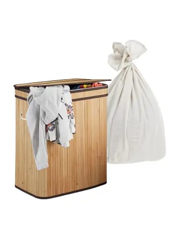 Mit dem Wäschesammler holst Du Dir einen praktischen Ordnungshelfer nach Hause. Die große Wäschebox verfügt über 3 Fächer für helle, dunkle und bunte Kleidung, sodass Du Schmutzwäsche bereits vorsortieren kannst. Dank des Deckels wird die Wäsche zudem diskret bis zum nächsten Waschgang verstaut. An den Griffen lässt sich der Kleiderkorb bequem zur Waschmaschine transportieren. Bei Bedarf kannst Du den Wäschetrenner platzsparend zusammenfalten und verstauen.Wäschekorb im Detail – Maße H x B x T: ca. 63 x 52 x 32 cm – Volumen: ca. 105 l – Traglast: ca. 10 kg – Material: Bambus, Polyester, Baumwolle, Viskose, Eisen, MDF – In verschiedenen Farben erhältlichFaltbarer Wäschebehälter mit Deckel – 3 Fächer zum Vorsortieren Deiner Schmutzwäsche – Mit Deckel – Inhalt der Wäschetruhe bleibt verborgen – Entnehmbarer Wäschesack ist bei 30 °C waschbar – An Tragegriffen bequem zur Waschmaschine transportieren – Bei Bedarf zusammenfalten und platzsparend verstauen – MDF-Boden und Metallring sorgen für sicheren Stand – Praktische Wäschetonne für Bad und SchlafzimmerLieferumfang – 1x Schmutzwäschekorb in Einzelteilen – Anleitung – Dekoartikel sind nicht im Lieferumfang enthalten