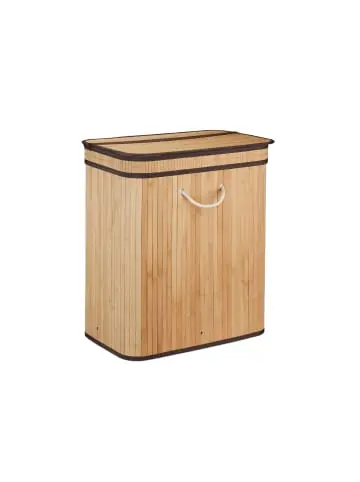 Mit dem Wäschesammler aus Bambus holen Sie sich ein praktisches und zugleich dekoratives Accessoire in Ihr Zuhause. Die Fertigung aus Bambus macht die Wäschetonne zum optimalen Möbel für Feuchträume. Die Wäschebox mit Klappdeckel verfügt über einen herausnehmbaren Wäschesack, der in zwei Kammern aufgeteilt ist. So haben Sie stets den Überblick über Ihre Wäsche und können bequem nach Farben oder Art der Kleidung sortieren. Bei Bedarf kann der Wäschetrenner zusammengefaltet und verstaut werden.Aufbauhilfe: 1. Bambusgestell aufklappen 2. Boden einlegen 3. Metallstange mit Knöpfen fixieren 4. Wäschesack überstülpen 5. Deckel-Aufsatz überstülpenWäschekorb Bambus im Detail – Maße H x B x T: ca. 63 x 55 x 35 cm – Kapazität: ca. 95 l – Material: Bambus, Polyester, MDF, Metall – Gewicht: ca. 2,7 kg – Verschiedene FarbvariantenRechteckige Wäschebox mit 2 Kammern – Einlegeboden mit praktischen Belüftungslöchern – Wäschesack herausnehmbar und waschbar (bei 30°)- Dank Henkeln aus Stoff leicht transportierbar – Wäsche in 2 getrennten Fächern sortieren – Dekorative Wäschekiste zum platzsparenden FaltenLieferumfang – 1x Wäschekorb in Einzelteilen – Dekoartikel sind im Lieferumfang nicht enthalten