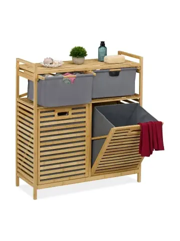Dieser Wäschesammler mit großer Ablage ist das perfekte Möbelstück für das Badezimmer. In den 2 kippbaren Wäschetruhen verstaust Du Deine Schmutzwäsche bereits vorsortiert bis zum nächsten Waschgang. Die Ablagefläche eignet sich ideal zum Aufbewahren von Handtüchern, Waschmittel oder auch Dekoartikeln, während 2 Stoffschubladen weiteren Stauraum bieten. Optisch überzeugt das Wäschekorbregal mit seiner Fertigung aus Bambus, die ein Stück Natürlichkeit in Dein Bad bringt.Wäschekorb im Detail – Maße H x B x T: ca. 95 x 88 x 33 cm – Gewicht: ca. 12 kg – Material: Bambus, Polyester – Farbe: Natur, GrauBadregal aus Bambus – Maße Ablage B x T: ca. 84 x 33 cm – Traglast Ablage: max. 10 kg – Volumen je Wäschesack: ca. 40 l – Traglast je Wäschesack: max. 5 kg – Innenmaße Schublade H x B x T: ca. 14,5 x 35 x 30 cm Schmutzwäschebehälter mit Ablage und Schubladen – Platzsparende Kombination aus Badregal und Wäschesortierer – Mit 2 kippbaren Schmutzwäschekörben aus grauem Stoff – Ordnungshelfer zum Vorsortieren Deiner Schmutzwäsche – Inklusive Ablageflächen für Handtücher, Deko und Waschmittel – 2 Stoffschubladen für zusätzlichen Stauraum in Bad und Schlafzimmer – Fertigung aus Bambus bringt natürlichen Charme ins BadezimmerLieferumfang – 1x Wäschebox in Einzelteilen – Mit Anleitung und Montagematerial – Dekoartikel sind nicht im Lieferumfang enthalten