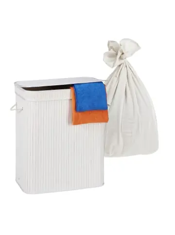 Mit dem Wäschesammler holst Du Dir einen praktischen Ordnungshelfer nach Hause. Die große Wäschebox verfügt über 3 Fächer für helle, dunkle und bunte Kleidung, sodass Du Schmutzwäsche bereits vorsortieren kannst. Dank des Deckels wird die Wäsche zudem diskret bis zum nächsten Waschgang verstaut. An den Griffen lässt sich der Kleiderkorb bequem zur Waschmaschine transportieren. Bei Bedarf kannst Du den Wäschetrenner platzsparend zusammenfalten und verstauen.Wäschekorb im Detail – Maße H x B x T: ca. 63 x 52 x 32 cm – Volumen: ca. 105 l – Traglast: ca. 10 kg – Material: Bambus, Polyester, Baumwolle, Viskose, Eisen, MDF – In verschiedenen Farben erhältlichFaltbarer Wäschebehälter mit Deckel – 3 Fächer zum Vorsortieren Deiner Schmutzwäsche – Mit Deckel – Inhalt der Wäschetruhe bleibt verborgen – Entnehmbarer Wäschesack ist bei 30 °C waschbar – An Tragegriffen bequem zur Waschmaschine transportieren – Bei Bedarf zusammenfalten und platzsparend verstauen – MDF-Boden und Metallring sorgen für sicheren Stand – Praktische Wäschetonne für Bad und SchlafzimmerLieferumfang – 1x Schmutzwäschekorb in Einzelteilen – Anleitung – Dekoartikel sind nicht im Lieferumfang enthalten