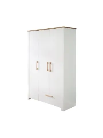 Der 3-türige roba Kleiderschrank ‚Ava‘ mit Korpus und Fronten im Dekor ‚Weiß‘ ist das Highlight in einem frisch eingerichteten Baby- oder Kinderzimmer. Der dekorative Kranz des Kinderzimmerschranks im Dekor ‚Artisan Eiche‘ rundet das Design des Schrankes gelungen ab. Hinter den 3 Türen und einer Schublade mit hochwertigen Massivholz-Griffen verbirgt sich viel Stauraum für Socken, Unterwäsche, Kinderspielzeug oder Bücher. Der Kleiderschrank mit 5 Böden und einer Kleiderstange bietet viel Platz um Kleidung zu verstauen. Durch die eingebaute Soft-Close Technik lassen sich die Türen, sowie Schubladen sanft und leise schließen. Der elegante 3-türige Kleiderschrank lässt sich mit weiteren Baby- und Kindermöbeln aus der Serie ‚Ava‘ perfekt zu einem komplett eingerichteten Baby- oder Kinderzimmer mit mitwachsenden Systemmöbeln erweitern. Der montagefreundliche Babyzimmerschrank ist in Deutschland entwickelt und wird in der EU produziert. HxBxT: 200 x 138,5 x 54 cm Korpus: Spanplatte (melaminbesch.), Stollen: MDF foliert, Fronten: Spanplatte (melaminbesch.), Füße: Massivholz, Griffe: Massivholz, Kleiderstange: Metall;