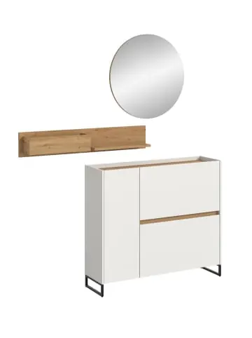 Drive Garderobenmöbel Set Weiß. Anzahl Paar Schuhe: 9.Tür Softclose. Diese 3-teilige Garderobenkombination mit Schuhkommode, Hängeregal und Spiegel bietet viel Stauraum. Maße ca. 197x140x32 cm. FSC®-zertifizierter Holzwerkstoff steht für Nachhaltigkeit. Pflegeleichte Oberfläche und schnelle Montage erleichtern die Nutzung. Perfekt erweiterbar durch weitere Artikel der Serie. Für ein organisiertes und stilvolles Zuhause.