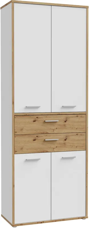 Maße: B84,5 x T41,5 x H226,4 cm. Mit 4 Drehtüren und 2 Schubladen bietet dieser Schrank viel Stauraum.. Die Einlegeböden sind variabel einsetzbar, für eine flexible Stauraumnutzung.. Die Oberfläche ist mit einer pflegeleichten Folie beschichtet.. FSC®-zertifizierter Holzwerkstoff:verantwortungsvoll.
