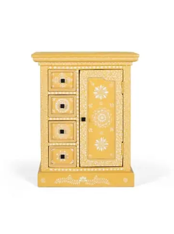 Dieses aus Mangoholz gefertigte Möbelstück verbindet die Wärme natürlicher Materialien mit dem Charme handwerklicher Handwerkskunst. Seine natürliche Oberfläche und die leuchtende Blumendekoration verleihen ihm einen einzigartigen und lebendigen Charakter. Dieses Stück verfügt über vier kleine Schubladen und eine Tür, die ein zusätzliches Staufach bietet. Sein Design wird durch einen Sockel an der Unterseite vervollständigt, der für Stabilität und ein elegantes Finish sorgt. FRONTMASSE: 12 x 15 cm, INNENSCHUBLADE: 10 x 12 x 22 cm, TÜRMASSE: 52 x 23 cm, INNENREGAL: 27 x 26 cm, DECKEL: 4,5 cm Wood