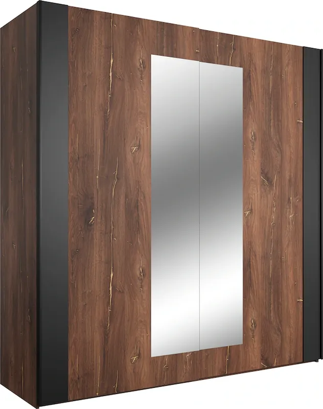 Der Kleiderschrank Sigma aus hochwertigem FSC-zertifiziertem Holzwerkstoff vereint modernes Design mit Funktionalität.. Der Kleiderschrank ist mit einem HETTICH-Laufsystem ausgestattet, das ein leichtgängiges öffnen der Schwebetüren des Schranks gewährleistet.. Die hochwertige Verarbeitung mit Metallbeschlägen, stabile Einlegeböden verspricht Langlebigkeit. Maße 200x213x64 cm (BxHxT).. Zeitlos und Pflegeleicht, es reicht ein weiches Tuch oder ein Ledertuch um die Oberfläche zu reinigen.. Moderner Schwebetürenschrank mit Spiegelflächen auf beiden Türen sowie organisierte Aufbewahrung