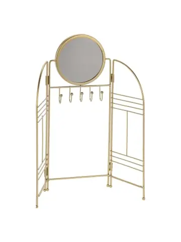 Schmuckhänger mit Spiegel, MetallFunktionalität: Der Schmuckaufhänger hat einen Spiegel und 5 Haken zur einfachen Aufbewahrung und Präsentation von Schmuck. Material: Der aus Metall gefertigte Aufhänger ist robust und langlebig, was eine langfristige Verwendung garantiert. Größe: Der Aufhänger misst 33 x 31,5 cm, sodass Sie verschiedene Schmuckstücke aufbewahren können, ohne viel Platz in Anspruch zu nehmen. Faltbar: Der Aufhänger ist zusammenklappbar, wodurch er einfach zu lagern und zu transportieren ist. Anwendung: Ideal zur Aufbewahrung von Ohrringen, Armbändern, Ketten und anderen kleinen Schmuckstücken. Es kann auch als dekoratives Element der Innenarchitektur dienen.Dieses Produkt darf sicher und in der vom Hersteller vorgesehenen Weise verwendet werden und ausschließlich gemäß den Anweisungen, Empfehlungen, Warnungen oder Sicherheitsinformationen, die auf dem Produkt oder seiner Verpackung angebracht oder beigefügt sind.