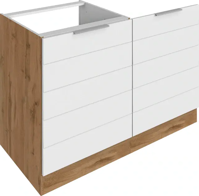 Hochwertige MDF-Fronten mit waagerechter Lisene. inklusive Front und Sockel für vollintegrierte Geschirrspüler. inklusive Edelstahlspüle. Maße B/T/H ca.: 120/60/82 cm. Made in Germany