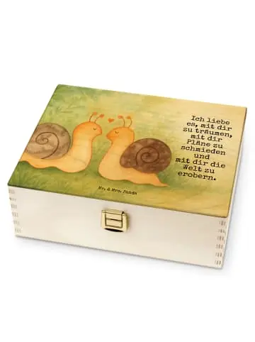 Verwandle deine Teestunde in einen Moment voller Romantik mit der zauberhaften Teekiste von Mr. & Mrs. Panda. Das liebevoll gestaltete Motiv Schnecken Liebe zeigt zwei verträumte Schnecken, die sich in inniger Zuneigung gegenüberstehen, während zarte Herzen ihre Verbundenheit symbolisieren. Begleitet von dem inspirierenden Spruch über das gemeinMensche Träumen und Pläne schmieden, wird diese Aufbewahrungsbox zu einem echten Herzensstück in deiner Küche. Sie ist weit mehr als nur ein praktischer Helfer, sie ist ein Symbol für die gemeinMensche Reise zweier Menschen, die zuMenschmen die Welt erobern wollen. Die Teebox bietet im Inneren eine strukturierte Unterteilung in mehrere Fächer, sodass deine liebsten Teesorten stets ordentlich sortiert und griffbereit sind. Jedes Mal, wenn du den Deckel öffnest, wirst du von der liebevollen Botschaft begrüßt, die das Herz erwärmt. Der hochwertige Druck besticht durch seine Langlebigkeit und die Brillanz der Farben, die direkt in das Naturmaterial einziehen. Diese Box ist ein wunderbares Geschenk für besondere Anlässe wie Jahrestage, Hochzeiten oder einfach als Zeichen tiefer Verbundenheit. Sie lädt dazu ein, sich Zeit für die wichtigen Dinge im Leben zu nehmen und die ZweiMenschkeit bei einer warmen Tasse Tee zu zelebrieren.Besondere Details deines neuen Lieblingsstücks:* Einzigartiges Design aus der exklusiven Liebe Kollektion von Mr. & Mrs. Panda. * Liebevoller Spruch für Partner und Lieblingsmenschen. * Mehrere Fächer im Inneren sorgen für perfekte Übersicht und Ordnung deiner TeeMenschmlung. * Aromaschonende Aufbewahrung durch einen passgenauen Deckel mit stabilem Verschluss. * Umweltfreundlicher Druck mit strahlenden, langlebigen Farben. * Ideal als Geschenk für Paare zur Verlobung, Hochzeit oder zum Valentinstag. * Handgezeichnetes Aquarellmotiv sorgt für eine warme und persönliche Atmosphäre.