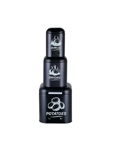 Die Vorratsbehälter bieten optimale Bedingungen zur Lagerung von Kartoffeln, Zwiebeln und Knoblauch. In den Zwiebelboxen wird das Gemüse dunkel und trocken gelagert, wodurch eine Keimbildung verhindert wird. Die Belüftungslöcher am Boden sorgen dabei für eine optimale Luftzufuhr. Auf diese Weise bleiben die Lebensmittel lange frisch. Dank des dekorativen Designs mit Print werden die Kartoffeldosen zu einem Hingucker in Deiner Küche.Kartoffel Aufbewahrungsbox 3er Set im Detail – Maße Kartoffelbehälter H x B x T: ca. 21,5 x 20 x 20 cm – Maße Zwiebelbehälter H x B x T: ca. 18 x 14,5 x 14,5 cm – Maße Knoblauchbehälter H x B x T: ca. 17 x 11,5 x 11,5 cm – Material: Stahl (0,5 mm) – In verschiedenen Farben erhältlichQuadratische Kartoffelboxen aus Metall – 3er Set zur Aufbewahrung von Kartoffeln, Zwiebeln und Knoblauch – Trockene und dunkle Lagerung verhindert Keimbildung – Belüftungslöcher am Boden sorgen für eine gute Luftzirkulation – Optimale Aufbewahrungsbedingungen für längere Haltbarkeit – Abnehmbare Deckel ermöglichen schnellen Zugriff – Dekoratives Design mit Print als Hingucker in der KücheLieferumfang – 1x Kartoffel-Aufbewahrungsbox – 1x Zwiebel-Aufbewahrungsbox – 1x Knoblauch-Aufbewahrungsbox – Dekoartikel sind nicht im Lieferumfang enthalten