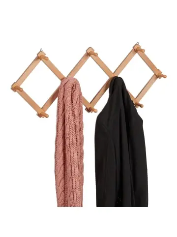 Ein aufgeräumter Eingangsbereich vermittelt sofort einen guten ersten Eindruck. Mit dieser Wandgarderobe sorgst Du für Ordnung und Übersichtlichkeit. An der Wand montiert, nimmt die Wandhakenleiste kaum Platz weg. Ziehe sie ganz nach Deinen Bedürfnissen auseinander oder falte sie weiter zusammen. An den 10 Kleiderhaken kannst Du Deine Taschen, Jacken, Handtücher und mehr aufhängen. Das moderne Design der schlichten Garderobenhaken aus Holz passt perfekt in Flur, Schlaf- und Arbeitszimmer.Wandgarderobe Holz im Detail – Gesamtmaße min. H x B x T: ca. 40 x 10 x 8,5 cm – Gesamtmaße max. H x B x T: ca. 5,5 x 111 x 7,5 cm – Gewicht: ca. 500 g – Traglast: max. 14 kg – Material: Lotusholz – Farbe: NaturAusziehbare Garderobenleiste – 10 Haken für Jacken, Schals, Handtaschen etc. – Ideal für den Eingangsbereich geeignet – Auch für Handtücher uvm. in Küche oder Bad verwenden – Je nach Platz auszieh- oder zusammenfaltbar – Modernes Design aus natürlichem Lotusholz – Dank 4 Aufhängungen schnell an der Wand montiertLieferumfang – 1x Scherengarderobe – Dekoartikel sind im Lieferumfang nicht enthalten