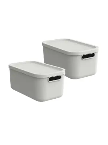 Aufbewahrungsbox 12 l 2er Set ALBULA LIGHT Wir erweitern unsere modernen und beliebten ALBULA Boxen um 2 weitere Größen. Die neuen, designorientierten 12 l und 20 l Boxen passen perfekt zu den bereits bestehenden Größen und ergänzen das komplett durchdachte System. Mit den neuen Modellen, welche in 5 verschiedenen, modernen Farben vorhanden sind, findet jeder die passende Größe sowie Farbe für sich. Somit schaffen Sie in Ihrem Zuhause eine total neue Art und Weise der Ordnung. Dank der offenen, ergonomischen Griffen können die Boxen, auch in beladenem Zustand, einfach getragen werden. Produktinformationen: Designorientierte BoxenSet enthält 2 BoxenVolumen je Box: 12lmit DeckelModular und stapelbarModernes DesignBequeme, offene GriffeEinfach zu reinigenHergestellt aus 100% recyceltem Kunststoff und 100% recycelbar