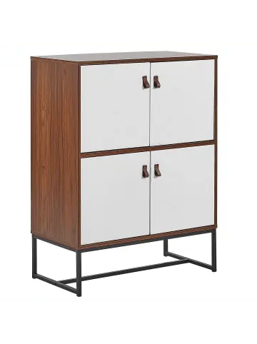 Moderner, halbhoher Mehrzweckschrank mit 4 Türen mit Fischgrätenmuster. Diese elegante und kompakte Kommode garantiert Ihnen viel Stauraum und nimmt gleichzeitig wenig Platz ein. Auf der oberen Ablagefläche im dunklen Holzfarbton können Vasen oder Bilderrahmen dekorativ platziert werden. Die vier Türen sind mit einem trendigen Fischgrätenmuster bestückt und ermöglichen Ihnen alle Kleinigkeiten, Unterlagen und Accessoires an einer Stelle unterzubringen. Die pulverbeschichteten Metallbeine sind äußerst standfest und verleihen dem Möbelstück einen industriellen und innovativen Look.Details: Typ: Sideboard Farbe: Weiß Material: MDF-Platte Zusätzliches Material: Kunstleder Gestellmaterial: Metall Tischplattenmaterial: Holzwerkstoff Türöffnungsarten: Standard Schubladen: Nein Finish: Melamin Türanzahl: 4 Regalböden: JaDimensions: Tiefe: 39 cm Breite: 76 cm Höhe: 100 cm Gewicht: 27 kg Max. Belastung pro Fach: 10 kg Max. Belastung der Oberplatte: 20 kgSie kaufen: 1 x SideboardProduktvorteile: Traditionelles Design mit moderner Note, Qualitativ hochwertiges Material, Stabile und solide Konstruktion, Rutschfester Stand, Viel StauraumMontage: Nicht montiert. 45 – 60 Min.Zusatzinformationen: Um die Haltbarkeit und die Ästhetik der Arbeitsplatte zu erhalten, sollte man Platzsets und Untersetzer verwenden und feuchte Stellen schnellstmöglich trocken wischen, um Produktschäden zu vermeiden.Pflegeanleitung:MDF-Platte: 1.Bitte ausschließlich milde Reinigungsmittel und weiche Tücher verwenden. Feuchte Stellen sofort trocken reiben.Eisen: 1.Bitte ausschließlich handelsübliche, milde Reinigungsmittel und weiche Tücher verwenden, wobei feuchte Stellen sofort trocken gerieben werden sollten 2.Vermeiden Sie scheuernde Reiniger, da diese die Oberfläche beschädigen können 3.Bei Chrom und Kupfer regelmäßig mit speziellen Pflegemitteln polieren.