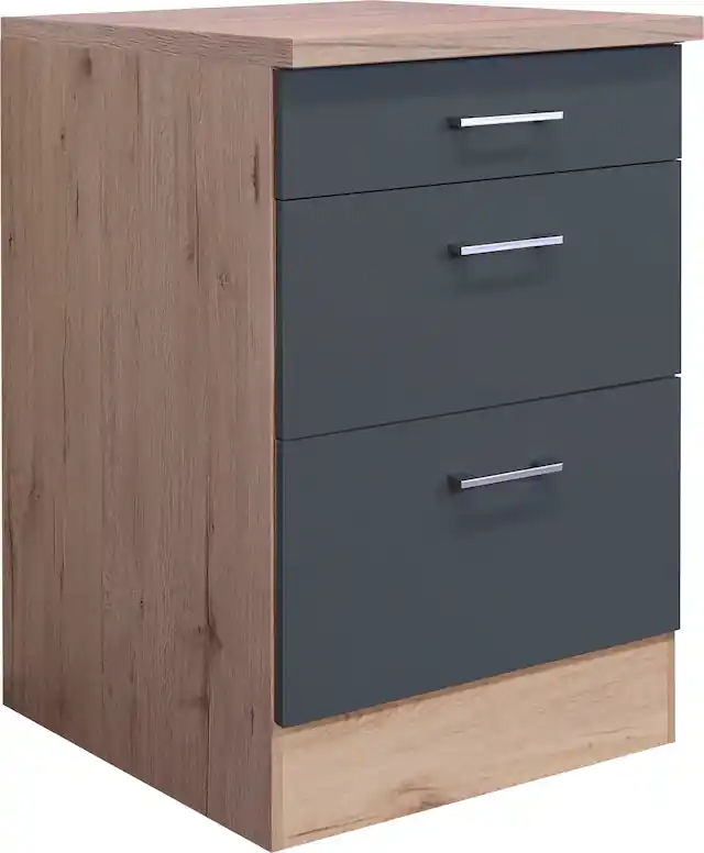 Unterschrank mit Schubkasten und Auszügen von Flex-Well, Made in Germany. Viel Platz für Besteck, Töpfe und Pfannen. Mit 28 mm starker moderner Arbeitsplatte, moderner Griff. Günstiger Küchenschrank in guter Qualität. Schnelle Lieferzeit bis in die Wohnung