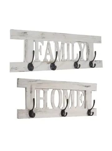 – Markeninhaber TÜV-Süd QM zertifiziert mit Nr. 12 100 59626 TMS für Qualitäts-Management in Deutschland – 2x Wandgarderobe mit 3 und 4 Doppelhaken – Mit dreidimensionalem Schriftzug – BSCI-Sozialstandards geprüft – Mit Aufhängevorrichtung – Kombinierbar mit unserer Shabby-Serie C60- Mit diesen Garderoben können Sie jede Wand dekorativ aufwerten! Durch den Shabby-Look wirkt jeder Flur, oder das Schlafzimmer viel wohnlicher. Die praktischen Haken machen es möglich, Ihre Kleidung schnell greifbar und übersichtlich unterzubringen.- Die gebürstete Oberfläche verleiht diesen Garderobenpaneels einen ganz eigenen, individuellen Used-Look, der einerseits rustikal, andererseits aber auch spielerisch leicht wirkt. Somit fügen sich diese Wandgarderoben nahtlos in jede Umgebung ein. Maße Schild Home (HxBxT) (ca.):Gesamt: 21x55x7 cmTiefe (ohne Kleiderhaken): 2 cm Maße Schild Family (HxBxT) (ca.):Gesamt: 21x60x7 cmTiefe (ohne Kleiderhaken): 2 cm Material:Paneel: PaulowniaholzHaken: Metall Lassen Sie sich von der lädiert anmutenden Oberfläche nicht täuschen, die Produkte dieser Serie sind qualitativ hochwertig verarbeitet und wurden nur aus den besten Materialien gefertigt. Die Holzelemente wurden aus der Paulownie hergestellt, einem auch schon in Europa kultivierten Wertholzbaum, der aufgrund seiner Leichtigkeit und hohen Stabilität auch als das Aluminium der Hölzer bezeichnet wird. Diese hübschen Wandgarderoben sind mit vielen weiteren Artikeln unserer Shabby-Serie C60 kombinierbar. Der Hersteller ist erfolgreich BSCI-geprüft. Dabei wird der Hersteller verpflichtet, sich an soziale Standards zu halten. Noten von A (sehr gut) – E (ungenügend) Soziales Managementsystem (Note D), Arbeitnehmerschutz (A), Recht auf Kollektivverhandlungen/Vereinigungsfreiheit (A), Keine Diskriminierung (A), Angemessene Vergütung (B), Angemessene Arbeitszeit (D), Arbeitssicherheit und Gesundheitsschutz (B), Keine Kinderarbeit (A), Arbeitsschutz für Jugendliche (A), Keine Scheinbeschäftigung (A), Zwangsarbeit (A), Umweltschutz (A), Ethisches Geschäftsverhalten (A) Auditor: Amfori, DBID: 351271, Audit Id: 165443 WICHTIG – bitte beachten: Versand erfolgt gleichzeitig in mehreren Paketen. Dennoch können wir nicht garantieren, dass diese zur selben Zeit ankommen. Ggfs. ist es notwendig die Pakete mit 2 unterschiedlichen Logistikern zu versenden.Versandzustand: Teilmontiert–Sicherheitshinweise für Teilartikel mit Artikelnummer 44991 Dieser Artikel ist eine Wandgarderobe und sollte nur als solche verwendet werden. Der Artikel ist nur für den Innenbereich geeignet. Überladen Sie den Artikel nicht. Vorsicht: Verletzungsgefahr! Beim Bohren in Wand oder Decke auf Kabel, Rohre sowie Gas- und Wasser-leitungen achten!Vorsicht Erstickungsgefahr! Verpackungsmaterial, wie Plastikbeutel, gehören nicht in Kinderhände. Bitte von Babys und Kleinkindern fernhalten! Nicht über den Kopf ziehen! Vorsicht: Verschluckungsgefahr! Achtung dieser Artikel kann verschluckbare Kleinteile enthalten! Halten Sie die Kleinteile von Kindern fern! Prüfen Sie den Artikel regelmäßig alle 3-6 Monate auf Beschädigungen und gelöste Verbindungen. Ziehen Sie lose Schrauben wieder fest an! Sollten Beschädigungen entdeckt werden, darf der Artikel nicht mehr genutzt werden! Benutzen Sie diesen Artikel nur für die bestimmungsgemäße Verwendung, im technisch einwandfreien Zustand und für private Zwecke. Andere Verwendungen gelten als nicht bestimmungsgemäß und können zu schweren Verletzungen und Beschädigungen führen. Für aus bestimmungswidriger Verwendung entstandene Schäden übernimmt der Hersteller keine Haftung.Allgemeine Hinweise: Bitte lesen Sie alle Hinweise sorgfältig durch, bevor Sie den Artikel aufbauen und verwenden. Verwahren Sie die alle Sicherheitsinformationen und Aufbauanleitungen gut auf. Für Ihre eigene Sicherheit und die Ihres Produktes, befolgen Sie bitte die Sicherheitshinweise. Eine falsche Handhabung könnte zu ernsten Verletzungen, beschädigtem Eigentum oder sogar dem Tod hinauslaufen.Pflegehinweise: Saugen Polstermöbel regelmäßig ab. Hat der Artikel einen Bezug pflegen und reinigen Sie diesen entsprechend nach Material (Textil, Leder, Kunstleder). Besteht ihr Möbel aus Holz nutzen Sie einen Staubwedel zur Reinigung. Für alle anderen Oberflächen und bei stärkerem Schmutz können Sie ein nebelfeuchtes Baumwolltuch verwenden. Keinesfalls sollten Sie scharfe oder scheuernde Reiniger verwenden, diese können Schäden verursachen. Für Möbel im Bad: Wasser und Kondenswasser sofort abwischen! Entsorgungshinweise: Entsorgen Sie den Artikel umweltgerecht. Überlegen Sie Alternativen zu Entsorgung wie Spenden oder Verkaufen. Elektrische Artikel gehören nicht in den Hausmüll. Entsorgen Sie diese an einem Recyclinghof für elektrische und elektronische Altgeräte, weitere Informationen erhalten Sie bei Ihrer örtlichen Gemeindeverwaltung. Einlagerungshinweise: Der Artikel sollte trocken und sauber sein, verwahren Sie diesen geschützt in dem Karton in dem er geliefert wurde.