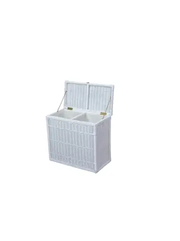 Praktischer Wäschesammler mit 2 Kammern. Gestell aus Massivholz Pinie, mit Rattan handgeflochten. Rechts/links mit praktischer, eingeflochtener Griffmuschel. Unter dem aufklappbarem Deckel sind 2 Kammern für Schmutzwäsche. Innen jeweils mit einem herausnhembarem Stoffeinsatz ausgestattet. Stoffeinsatz beigefarben (65% Baumwolle/35% Polyester). Ideal für die Trennung von Wäsche. Maße innen je Kammer ca. cm: B. 28 x T. 28 x H. 51 cm. Gesamtmaße ca. cm: B. 69 x T. 37 x H. 61 cm. Lieferbar ist der große Wäschesammler in 4 trendigen Farbausführungen: beigefarben gebeizt und lackiert, weiß lackiert, braun gebeizt und lackiert und naturgrau lackiert- In 4 trendigen Farben- Handgeflochten- 2 Kammern zum idealen sortieren der Wäsche- Stabile Konstruktion mit viel Stauraum- Montiert