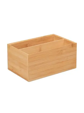 Mit dieser Allzweckkiste holst Du Dir ein wahres Universaltalent zum Ordnen, Aufbewahren und Transportieren verschiedenster Dinge nach Hause. Der zeitlose Bambuskasten mit 2 Fächern eignet sich wunderbar zum griffbereiten Verstauen von Utensilien im Badezimmer, als Aufbewahrung in der Küche, als Ordnungsbox in Wohnzimmer und Büro oder zur Aufbewahrung des Spielzeugs im Kinderzimmer. Die stabile Bambusbox überzeugt als Ordnungshelfer und setzt dank natürlicher Maserung warme Akzente im Raum.Aufbewahrungskiste Bambus im Detail – Gesamtmaße H x B x T: ca. 14 x 30 x 20 cm – Innenmaße je Fach H x B x T: ca. 12,5 x 28,5 x 9 cm – Max. Traglast: 5 kg – Gewicht: ca. 1 kg – Material: Bambus – Farbe: NaturStabile Aufbewahrungsbox mit 2 Fächern – Zum Verstauen verschiedenster Dinge des täglichen Bedarfs – Platzsparender Stauraum dank stapelbarer Konzeption – Für Küche, Bad, Wohnzimmer, Kinderzimmer, Büro etc. – Dank offenem Design schneller Überblick über verstaute Utensilien – Robuster Bambus mit natürlicher, dekorativer MaserungLieferumfang – 1x Bambusbox – Dekoartikel sind im Lieferumfang nicht enthalten