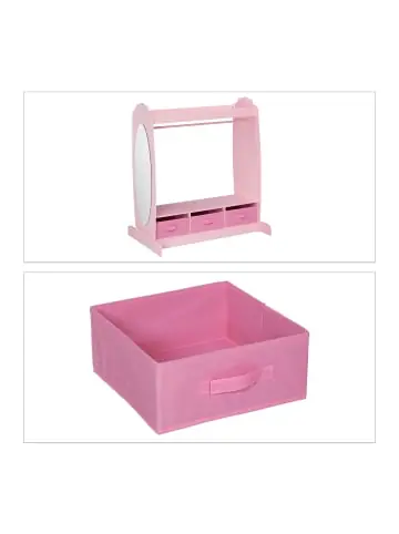Die rosafarbene Kleidergarderobe ist das ideale Möbelstück für kleine Prinzessinnen, um ihre Kleidung ordentlich aufzuhängen oder abzulegen. Neben einer Garderobenstange und einem Kleiderhaken für Jäckchen, Kleidchen oder Shirts verfügt das Kleidergestell auch über diverse Ablageflächen samt 3 Stoffboxen. Ein ovaler Spiegel rundet die Standgarderobe ab. Dank der kindgerechten Größe können Deine Sprösslinge ihre Kleidung selbstständig aufräumen und so ganz nebenbei lernen, Ordnung zu halten.Kinder Kleiderständer im Detail – Gesamtmaße H x B x T: ca. 107 x 97,5 x 61 cm – Max. Traglast: 20 kg – Gewicht: ca. 21,3 kg – Material: MDF, Polyester, Glas – Farbe: RosaKindergarderobe mit Ablagen und Spiegel – Kleiderstange B x D: ca. 90 x 1,5 cm – Oberes Fach H x B x T: ca. 6 x 90 x 27,5 cm – Innenmaße je Stoffbox H x B x T: ca. 12 x 28,5 x 29 cm – Kleiderhaken H x B x T: ca. 9 x 3 x 4 cm – Spiegel H x B: ca. 77 x 31 cmFreistehende Kinderzimmer-Garderobe – Garderobenständer mit Kleiderstange, Haken und Ablagen – Zum Aufhängen und Ablegen von Kleidung im Kinderzimmer – Mit ovaler Spiegelfläche zum Betrachten des Outfits – Kindgerechte Größe zum eigenständigen Aufräumen der Kleidungsstücke – Abgerundetes, rosafarbenes Design ideal für kleine Prinzessinnen – Kleidergestell besteht aus robusten Materialien und steht stabilLieferumfang – 1x Kinder Garderobenständer in Einzelteilen – Montagematerial und Anleitung – Dekoartikel sind im Lieferumfang nicht enthalten