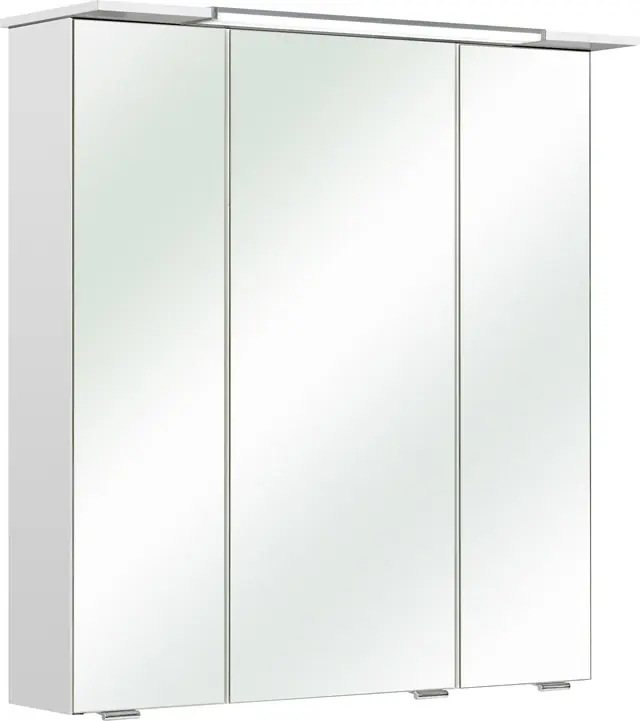 Der Spiegelschrank bietet mit den Maßen B67 x T16 x H71 cm ausreichend Stauraum hinter drei Spiegeltüren. Die 6 Einlegeböden sorgen für eine optimale Organisation im Badezimmer.. Der 3-türige Spiegelschrank inkl LED-Beleuchtung verfügt über eine Schalter/Steckdosen-Kombination für bequemes Aufladen und Verwenden von elektronischen Geräten.. Die LED-Beleuchtung sorgt für eine helle Ausleuchtung des Gesichts beim Schminken oder Rasieren, mit einer Leistung von 12V und 235LM.. IP44 zertifiziert für den Einsatz im Badezimmer und eine Stromzuleitungslänge von ca. 50 cm für flexible Installation.. Die zerlegten Möbel können, mit der Montageanleitung im Paket, schnell und einfach aufgebaut werden. Deutscher Hersteller und deutsche Produktion – Qualität made in Germany