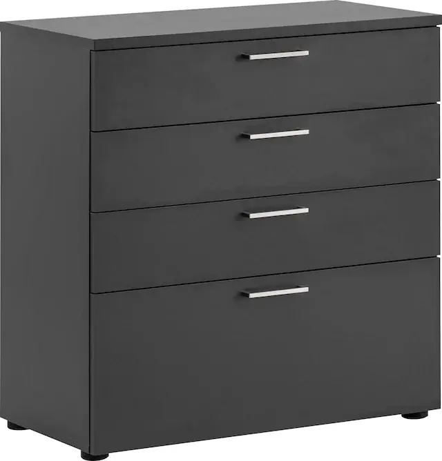 Maße: B80,2 x T41 x H84,2 cm. Mit 3 Schubladen und 1 Auszug bietet diese Kommode viel Stauraum.. Die melaminharzbeschichtete Oberfläche ist langlebig, kratzfest & pflegeleicht.. Metallgriffe und kugelgelagerte Auszugschienen sorgen für eine edle Optik und sanftes Öffnen.. FSC®-zertifiziert