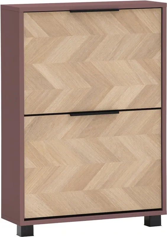 2 Klappen mit 1-reihigen Schuhtrommeln. Fronten in Fischgräte Optik. Platz für bis zu 6 Paar Schuhe (bis Größe 44/45). Made in Germany