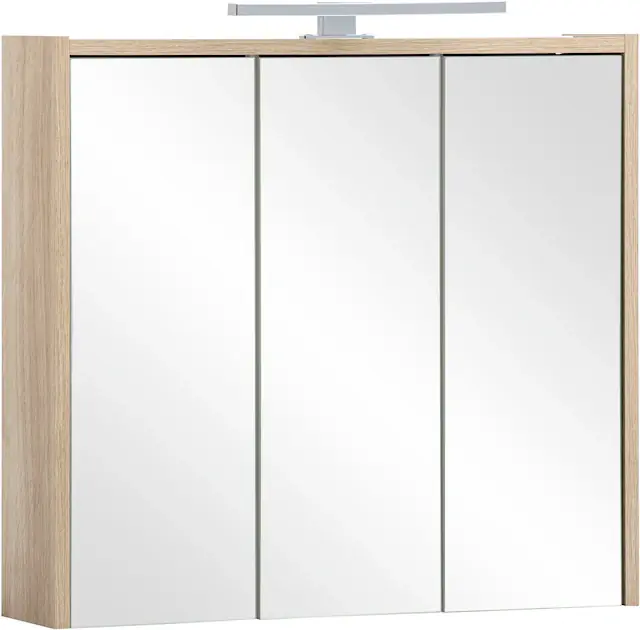 Spiegelschrank mit LED-Beleuchtung. Schalter -/Steckdosenkombination im rechten Türfach. Höhenverstellbare Glaseinlegeböden. Hängende Montage. Made in Germany