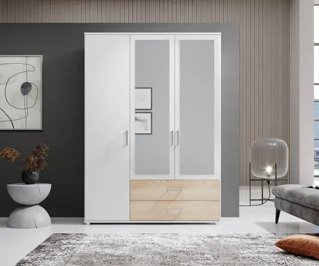 Die Einlegeböden bieten viel Platz, zudem ist die Kleiderstange ideal für hängende Kleidungsstücke. Dadurch wird der Stauraum optimal genutzt und übersichtlich organisiert.. Die Schubkästen sind perfekt für kleinere Gegenstände und sorgen dafür, dass alles an seinem Platz bleibt. Durch die Aufteilung ist es einfach, Ihre Kleidungsstücke zu finden.. Dank des Designs benötigt der Kleiderschrank nur wenig Platz in Ihrem Zimmer und bietet dennoch ausreichend Stauraum. Dadurch ist er eine platzsparende Lösung für alle Räume.. Die hochwertige Verarbeitung und die robusten Materialien gewährleisten eine lange Lebensdauer des Kleiderschranks.. Das zeitlose Design des Kleiderschranks fügt sich nahtlos in jeden Einrichtungsstil ein und verleiht Ihrem Zuhause eine elegante Note.